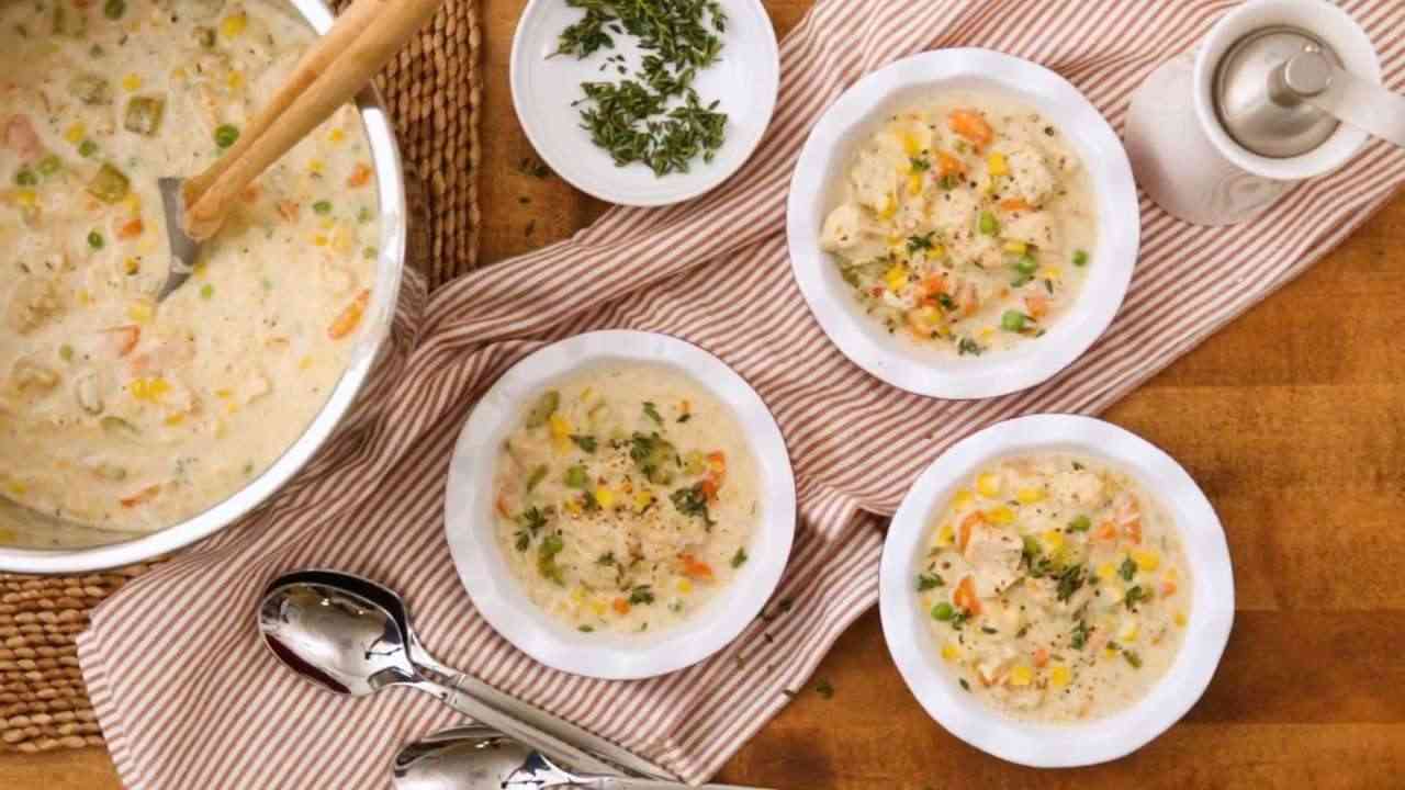 - Step 1:Combine chicken, broth, carrots, celery, corn, onion, salt, garlic powder, onion powder, black pepper, poultry seasoning, and thyme in a multi-functional pressure cooker (such as Instant Pot). Close and lock the lid. Select high pressure according to manufacturer's instructions; set timer for 10 minutes. Allow 10 to 15 minutes for pressure to build.